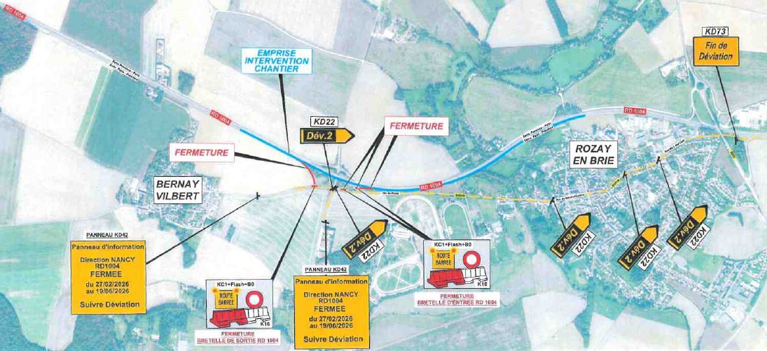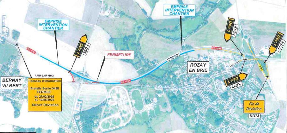 📢 Il ne sera pas possible d’accéder à la RD1004 ni d’en sortir en direction de la Province au niveau de l’échangeur de Bernay-Vilbert.